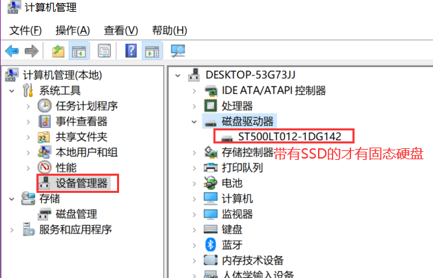 1.桌面上,右键我的电脑/计算机/此电脑 - 管理 - 计算机管理(本地)- 设备管理器 - 磁盘驱动器, 带有SSD的才是固定硬盘,下图的没有带SSD的,所以此电脑没有固态硬盘
